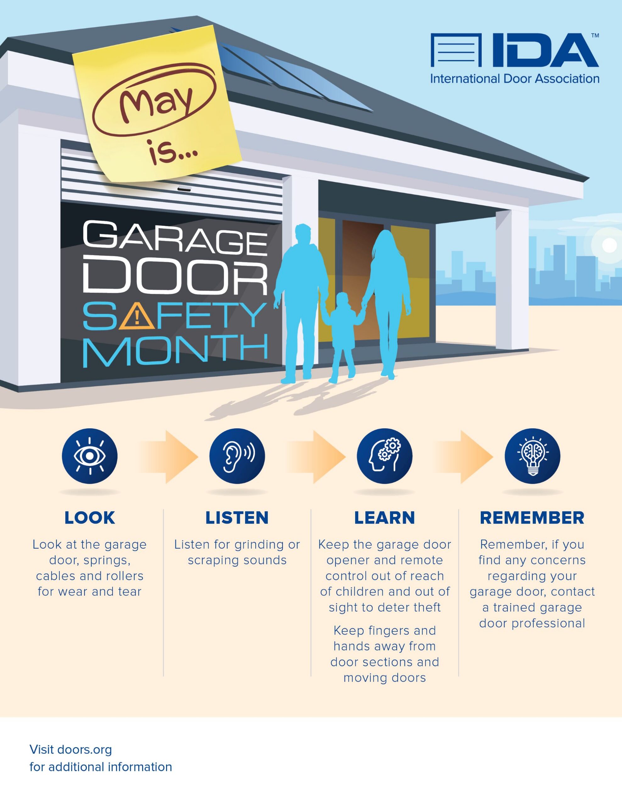 Garage door safety is imperative to our industry which is why IDA holds special recognition during this time. Though garage door safety is important year-round, having Garage Door Safety Month in May allows members to highlight their dedication to safety even further – bettering our industry, your company, and the public annually. Let’s Look, Listen, Learn, and Remember during the month of May.